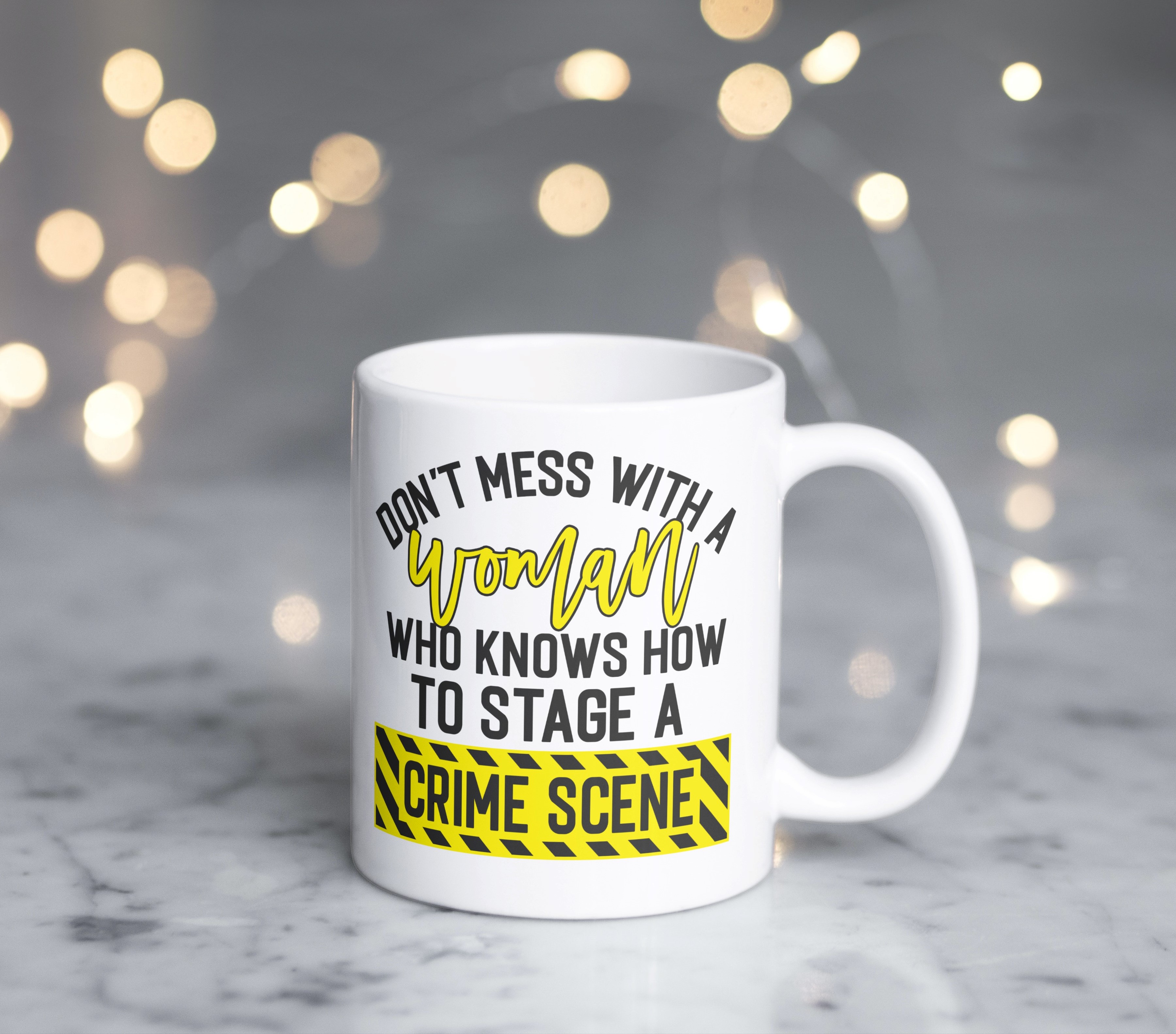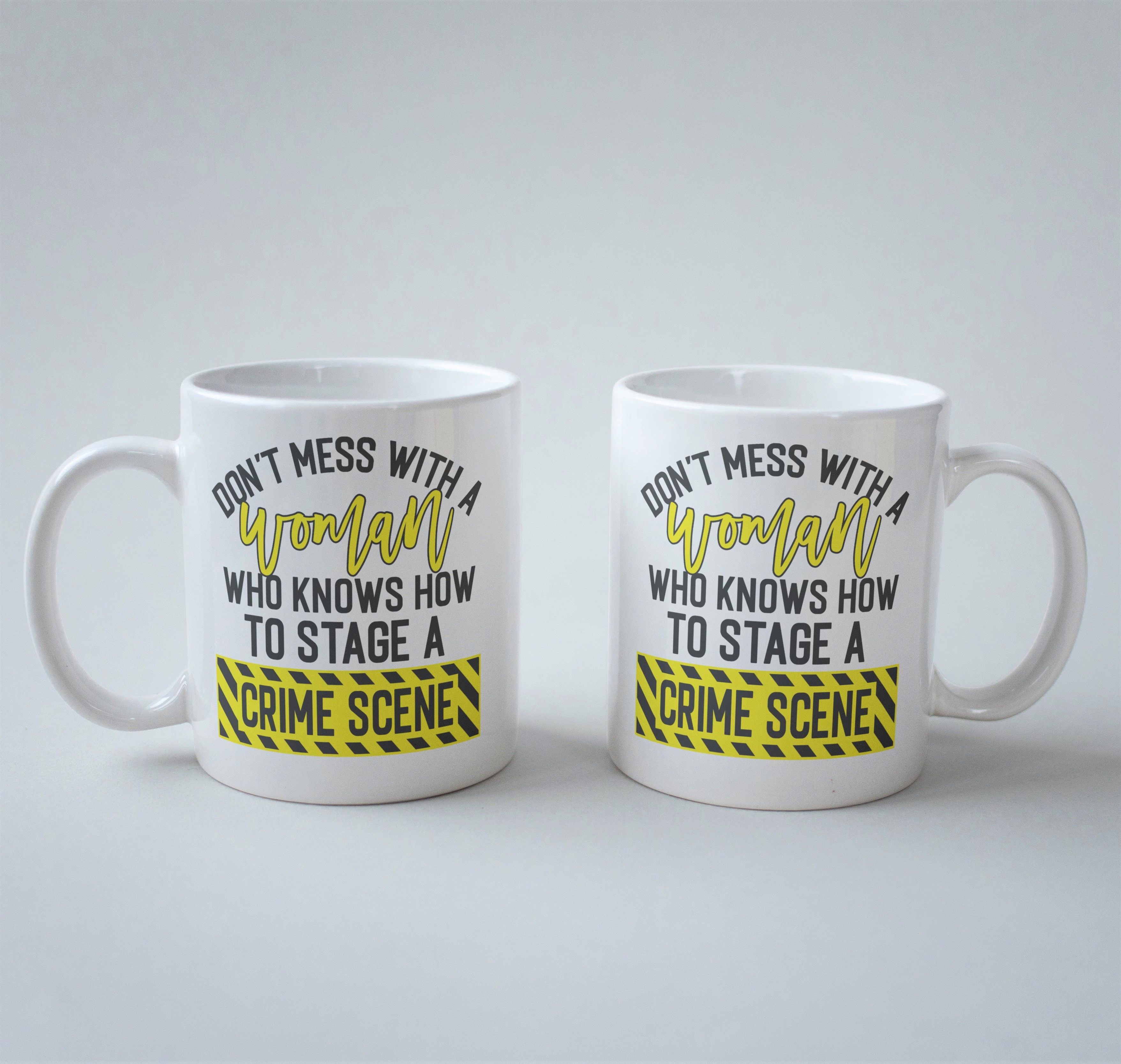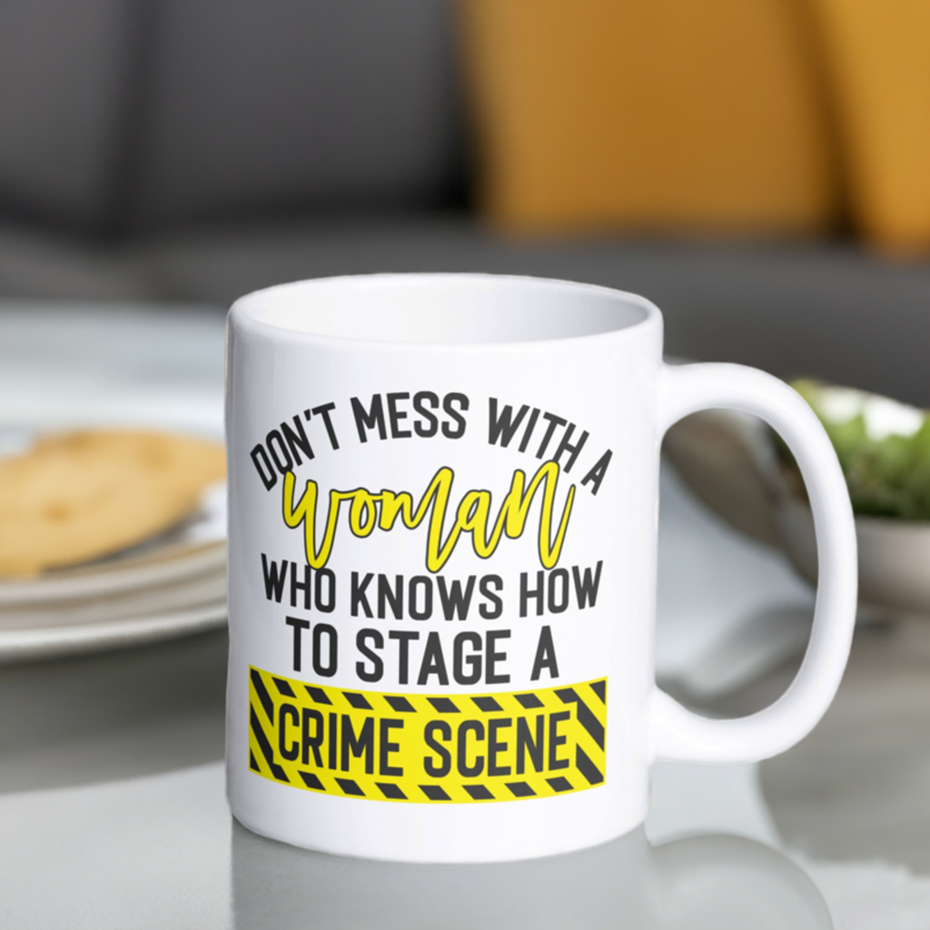 Introducing our hilarious and stylish "Don't Mess with a Woman who knows how to stage a crime scene" mug, designed for all the crime show enthusiasts out there! This mug is the perfect gift for any woman who loves to immerse herself in thrilling crime documentaries and mysteries. With its witty quote, this mug will surely bring a smile to her face every time she takes a sip of her favourite beverage.